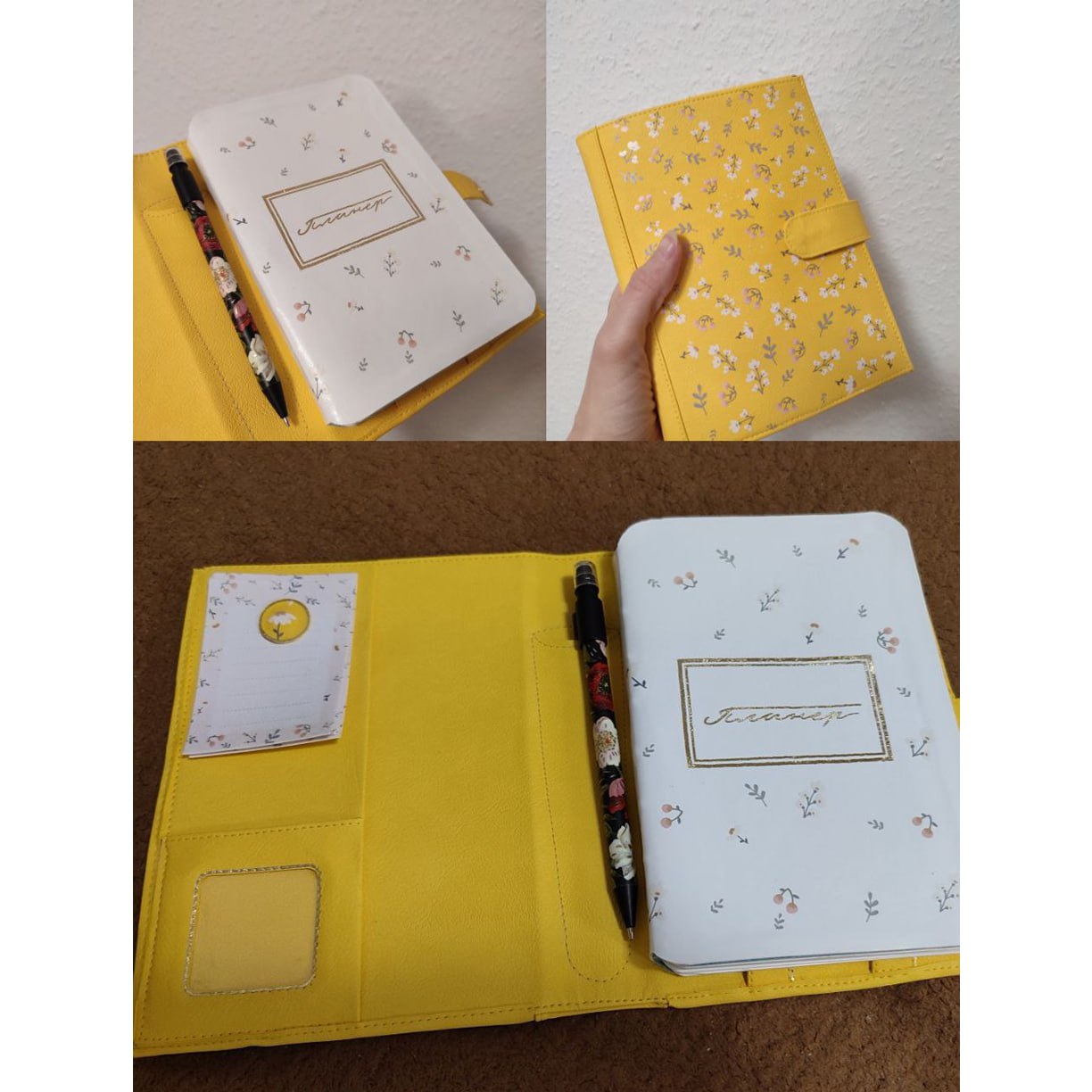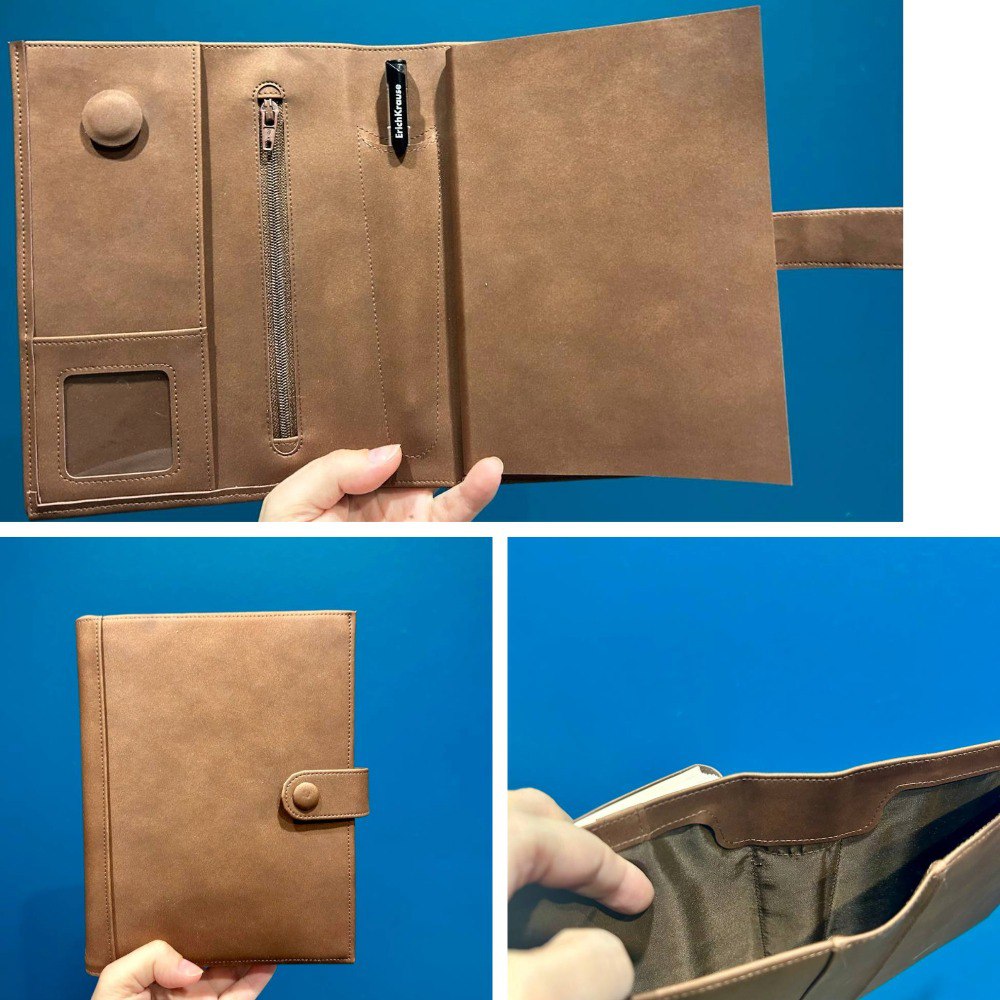 Мягкая обложка с большим карманом между слоями и множеством кармашков для мелочей плюс сменный блокнот в переплете или на кольцах к ней