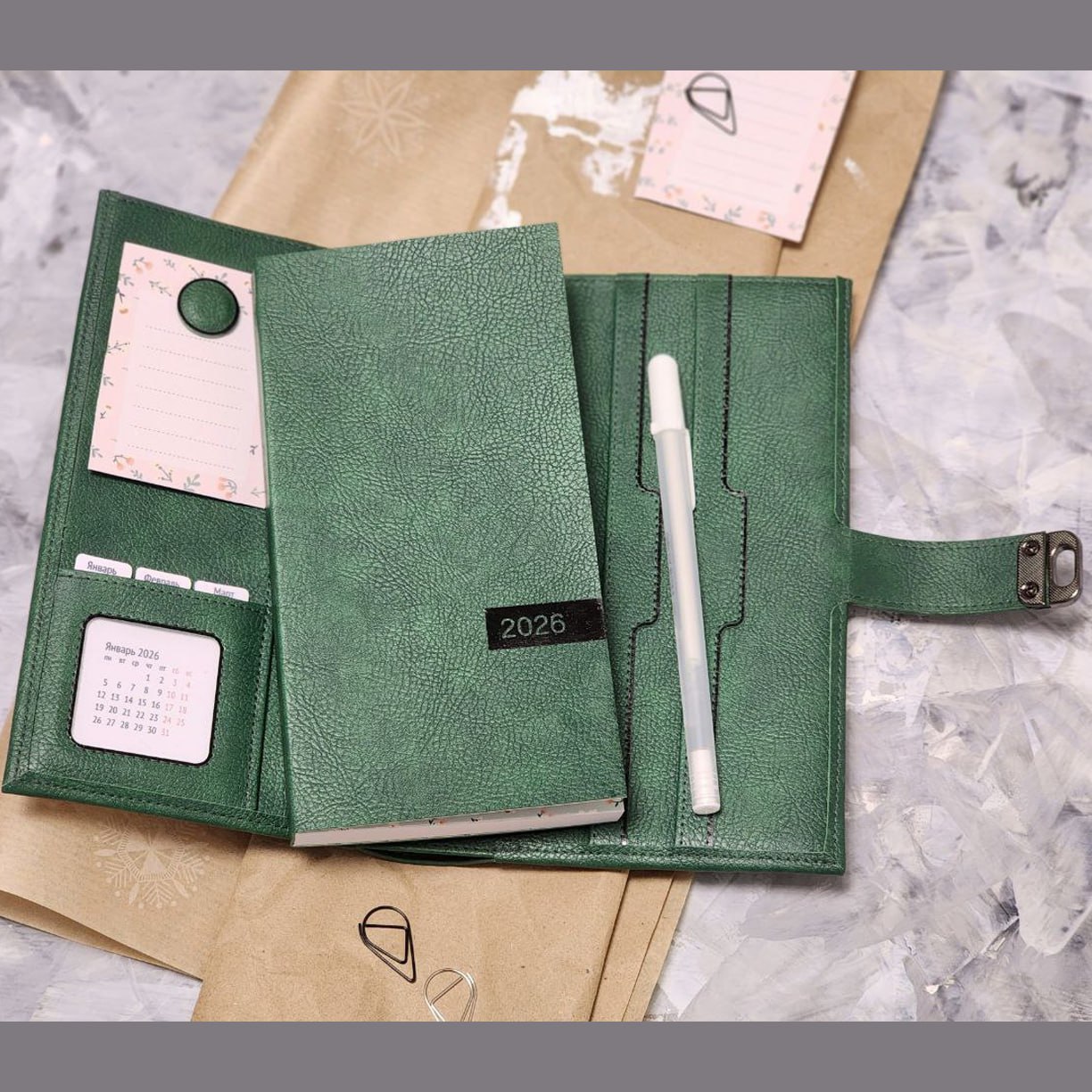 Мягкая обложка с большим карманом между слоями и множеством кармашков для мелочей плюс сменный блокнот в переплете или на кольцах к ней