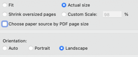 ЛАЙФХАК! Мой принтер не печатает без полей на бумаге нестандартного размера, а бумагу размером более 240 мм по длинной стороне при покупке в больших листах и резке их на формат приобретать невыгодно. Поэтому я, чтобы боковые маркеры (видны при перелистывании) находились достаточно ближе к краю, обхитрила принтер и поставила пользовательский размер бумаги чут больше, 180х245мм. А настройке печати PDF поставила альбомную ориентацию, вот так: