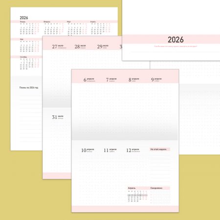 Эти странички с датами на 2026 год. Вы получаете 4 файла: с розовыми заливками, более нейтральный с серыми заливками и бордовыми акцентами, файл без заливок и файл с дизайном с цветами: